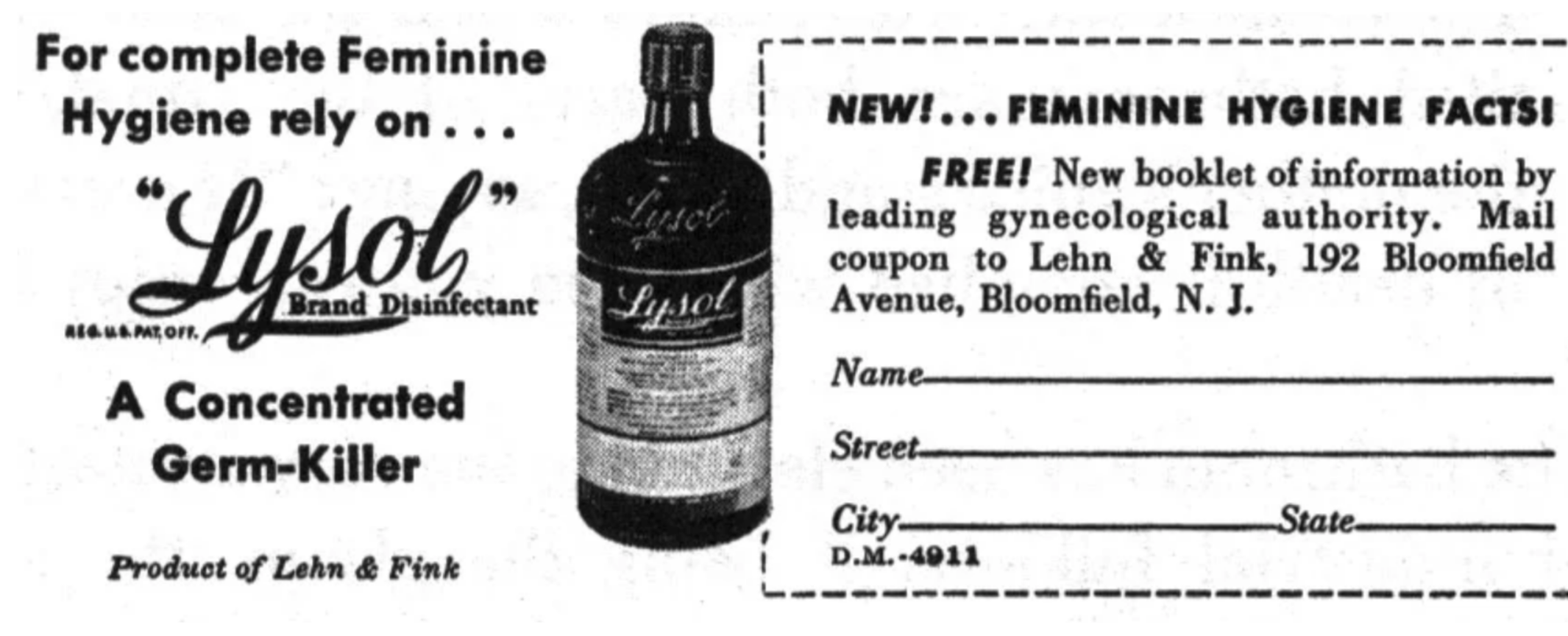 Lysol itself wasn’t a “vaginal perfume” — it was marketed as a feminine hygiene and contraceptive product from the 1920s through the 1950s.